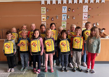 Alle Kinder aus der ersten Klasse freuten sich riesig über ihren neuen Sumsi-Rucksack. Vielen Dank an die Raiffeisenbank!